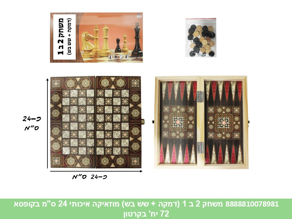 משחק 2 ב 1 (דמקה + שש בש) מוזאיקה איכותי 24 ס"מ (כלי עץ) בקופסא (72)
