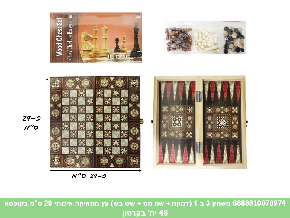 משחק 3 ב 1 (דמקה + שח מט + שש בש) עץ מוזאיקה איכותי 29 ס"מ (כלי עץ) בקופסא (48)